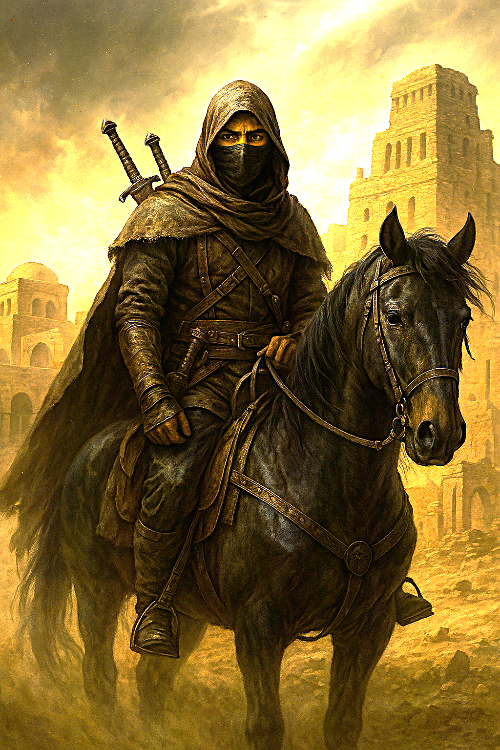 Appearance: Powerful physique, intense eyes, scarred yet noble features, disguised as a simple farmer concealing his warrior past